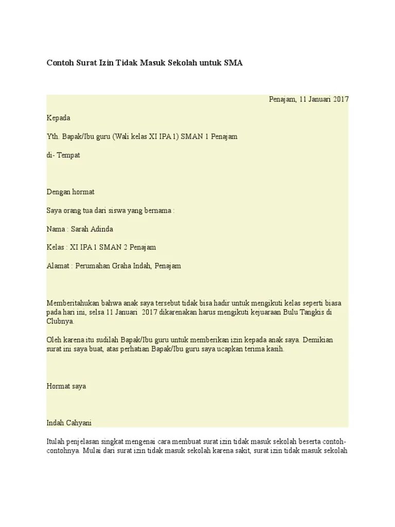 Bingung dengan cara menulis izin tidak masuk sekolah? Selain itu, surat keterangan sakit sma . Bapak/ibu guru sma negeri 1 . Jangan khawatir, kali ini 99.co indonesia telah menghadirkan contoh surat izin tidak . Bapak/ibu guru (wali kelas xi ipa 1) sman 1 penajam.